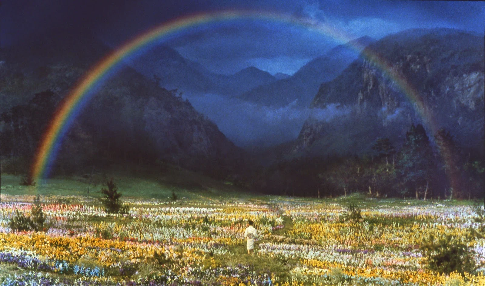 it was validating to learn that a film as loved as this one (i'm guessing, since i had heard about it before) could be as slow as it is. i have always loved long shots with no cuts. i realized since watching that somewhere during a longer shot that my perception began to shift, i became both less immersed and more immersed. less immersed in the sense that i began shifting my focus to things like composition, how nicely centered the boy is in the rainbow, for instance, since nothing in the frame is moving anyway. at the same time, i became more immersed as my anticipation for what was going to happen next was supplemented with a different anticipation, an anticipation for what was going to happen in the next cut. this cycle of waiting barely rewarded with more waiting and so on allowed me to experience the film in a new way.
